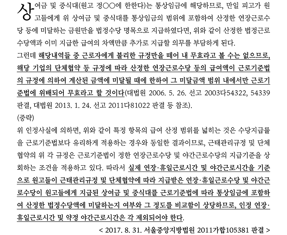 판례는 ①에 대해서는 해당 내역들 중 근로자에게 불리한 규정만을 떼어 내 무효라고 볼 수는 없다라고 하면서 인정 연장·휴일근로시간 및 약정 야간근로시간은 제외되어야 한다고 판단하였고,