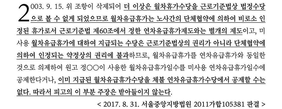 판례는 월차휴가수당은 근로기준법상 인정되는 권리가 아니라 약정상의 권리에 불과하기 때문에 근로기준법상 인정되는 연차휴가수당 즉, 사용자가 근로기준법에 따라 지급하여야 하는 연차휴가수당에 이미 지급한 월차휴가수당에서 공제할 수는 없다고 판단하였다.