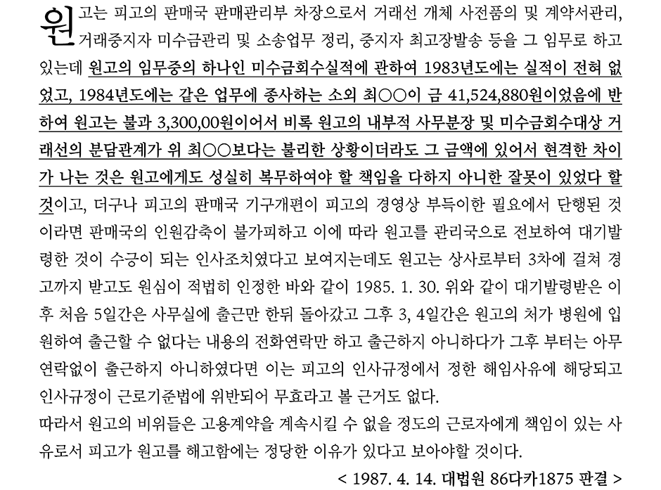 업무능력 미달로 인한 해고가 정당하다고 본 다른 사례(1987. 4. 14. 대법원 86다카1875 판결)에서는 미수금 회수 실적에 있어서 다른 근로자의 실적이 4,150만원인데 반해 해고가 부당하다고 주장하는 근로자의 실적은 330만원에 불과하였고(전년도에는 실적 없었음), 그간의 업무 태도도 지극히 불성실하여 (업무능력이 부족한) 근로자에 대한 해고가 정당하다고 보았다(아래 판례 참고).