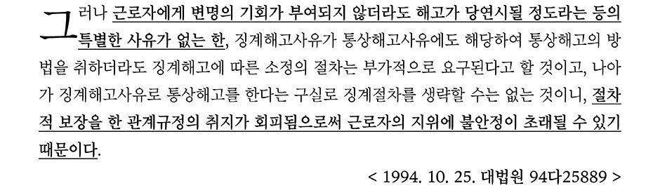 다시 말해 징계해고사유로 통상해고를 하는 것은 해고의 절차를 보장한 관계규정의 취지가 회피되고 근로자의 지위에 불안정이 초래될 수 있기 때문에 '근로자에게 변명의 기회가 부여되지 않더라도 해고가 당연시 될 정도라는 등의 특별한 사유'가 있어야 징계절차 없이 통상해고(일반해고)를 할 수 있는 것이고, 그렇지 않은 경우라면 징계절차를 거쳐야 한다.