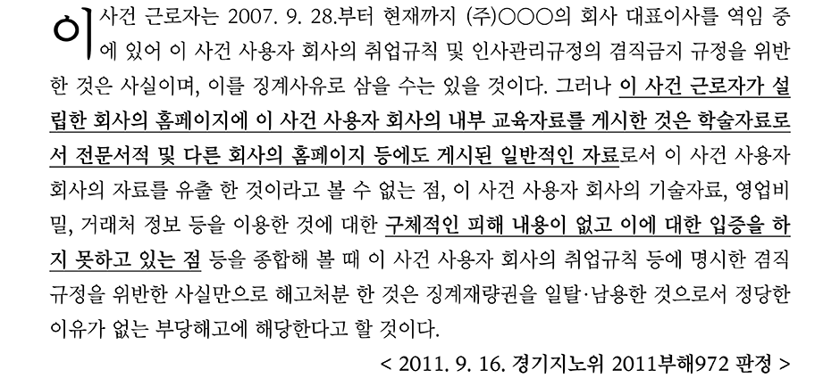 반면, 2011부해972 판정은 겸직금지 규정을 위반한 것은 징계사유로는 삼을 수 있으나, 영업비밀유지의무와 관련하여서는 회사의 내부 교육자료는 학술자료로 전문서적 및 다른 회사의 홈페이지 등에도 게시된 일반적인 자료로 회사의 자료를 유출한 것으로 볼 수 없다고 판단하였다(다만, 이 사건은 중앙노동위원회의 재심에서 겸직금지 규정 위반에 따라 사용자와의 신뢰관계를 기대할 수 없다고 판단하여 해고가 정당하다고 판단하였다. 즉, 영업비밀이 문제 된 사안이 아니라 겸직금지 규정이 위반된 사안이었다).