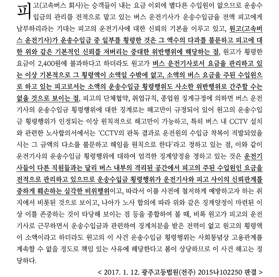 광주고등법원(전주) 2015나102250 판결에 따르면 버스요금 2,400원을 횡령한 고속버스 운전기사를 해고한 것은 정당하다는 취지로 판결한 바 있다.