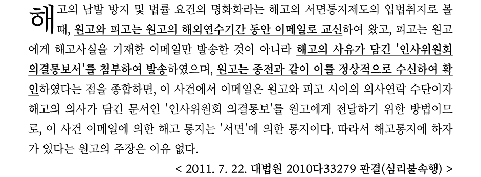 위 판례의 사실관계에 의하면 판례는 해외연수로 국내 근로자와 다르게 정상적인 방법으로 서면을 수령할 수 없는 상황에서 평상시에 회사와 이메일로 연락을 주고받아온 상황이었다. 이러한 상황에서 회사 측의 인사위원회 의결통보서를 근로자가 정상적으로 수신하였다면 '서면'에 의한 통지가 이루어졌다고 판단하였다.