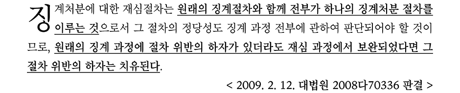 따라서 최초 1차 징계위원회에서 소명기회가 부여되지 않았거나 기타 절차 위반의 하자가 있다 하더라도 재심과정에서 최초의 징계절차 위반의 하자가 소명기회의 부여 등으로 치유되었다면 징계절차의 위반은 없게 된다.