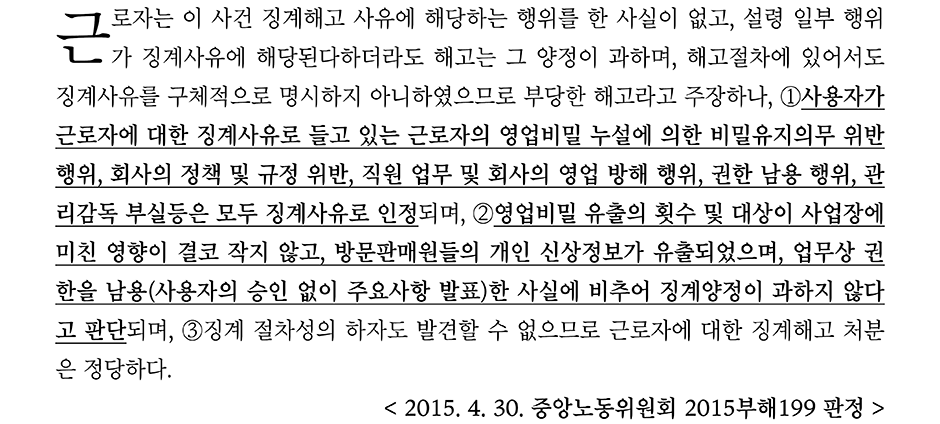 중앙노동위원회의 2015부해199판정은 지방노동위원회를 거쳐 중앙노동위원회에서도 영업비밀유지 의무를 위반한 근로자를 해고한 것을 정당하다고 판단한 사례인데, 방문판매원들을 관리하는 근로자가 방문판매원들의 주민등록번호, 휴대폰번호, 주소 등 개인 신상에 해당하는 정보와 사용자의 영업비밀과 관련된 사항을 여러 사람을 대상으로 약 1년에 걸쳐 수차례 반복하여 유출을 하였고, 회사는 해당 사유로 근로자를 해고하였고 노동위원회에서는 해고가 정당하다고 판단하였다.