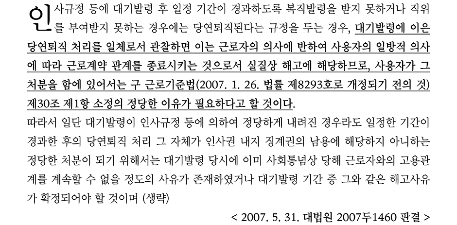 위 대법원 2007두1460 판결에서는 회사가 근로자를 인사명령의 일환으로 근로자를 대기발령시킨 뒤에 '대기발령 후 3개월 이내에 재발령을 받지 못하였을 때에는 그 사유 발생일에 당연퇴직된 것으로 간주한다'는 규정을 두었다. 당연퇴직은 일정한 사유가 발생하면 별도의 의사표시 없이 근로관계가 종료되며, 정년의 도달, 계약기간의 만료를 예로 들 수 있다. 따라서 회사의 입장에서는 (해고까지는 아니더라도) 대기발령의 사유가 발생하여 근로자를 대기발령시켜 업무에 배제시킨 뒤에 고의적으로 재발령을 하지 않는다면 해고가 아닌 당연퇴직이 되는 셈이다.