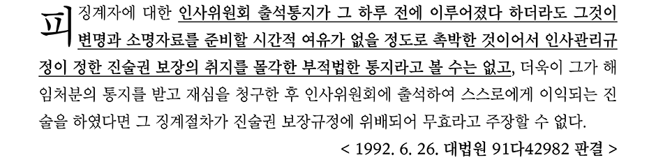 소명·진술기회가 부여됐는지 여부는 형식상으로 부여됐는지 여부가 아니라 실질적으로 근로자의 방어권 행사에 지장이 있었는지 여부로 판단하게 된다.