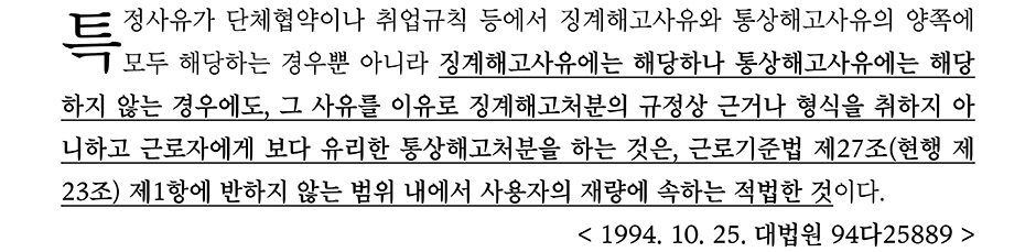 판례는 기본적으로 징계해고사유에는 해당하나 통상해고사유에는 해당하지 않는 경우에도 사용자가 통상해고처분을 하는 것은 가능하다고 본다.