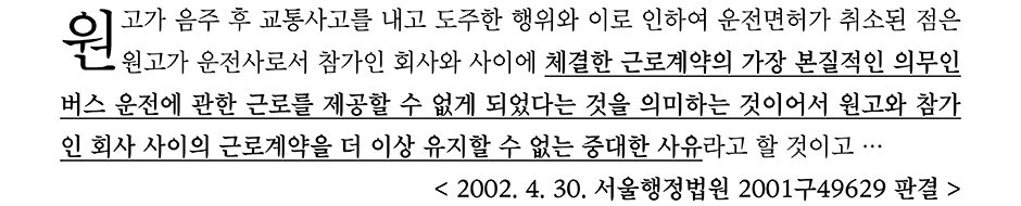 같은 운전면허의 취소라고 하더라도 2001구49629 판결에서는 운전기사의 본질적인 업무인 버스 운행이라는 근로제공을 할 수 없기 때문에 근로계약을 더 이상 유지할 수 없는 중대한 사유에 해당되지만, 2009구합21529 판결에서는 지점장의 업무가 반드시 운전면허를 요구하는 업무가 아니므로 회사의 업무에 주는 지장이 크지 않다고 하여 해고 사유의 정당성을 인정하지 않았다.