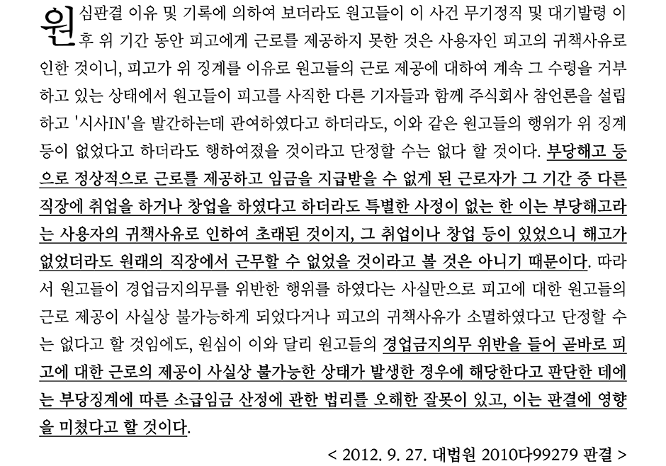 아래의 대법원 2010다99279 판결에서는 시사저널 소속 기자들이 대표이사가 기사 편집에 영향력을 행사하는 것에 반발하자 회사가 기자들에게 무기정직 및 대기발령을 시켰고, 정직기간 동안 일부 기자들이 시사IN을 발간하는 경쟁매체를 발간 즉, 경업금지의무를 위반하였다고 하여 근로자들을 해고한 사건이었다.