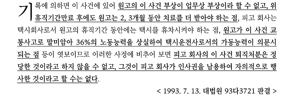 따라서 동일한 운전면허의 취소라 하더라도 근로계약의 본질 즉, 근로자가 근로계약의 주된 의무를 수행할 수 있는지 여부로 판단하게 되므로 운전면허의 취소로 노동능력이 상실된다면 해고의 사유가 될 수 있지만 운전면허의 취소가 노동력의 상실이 아니라면 정당한 해고의 사유가 되지는 않는다.