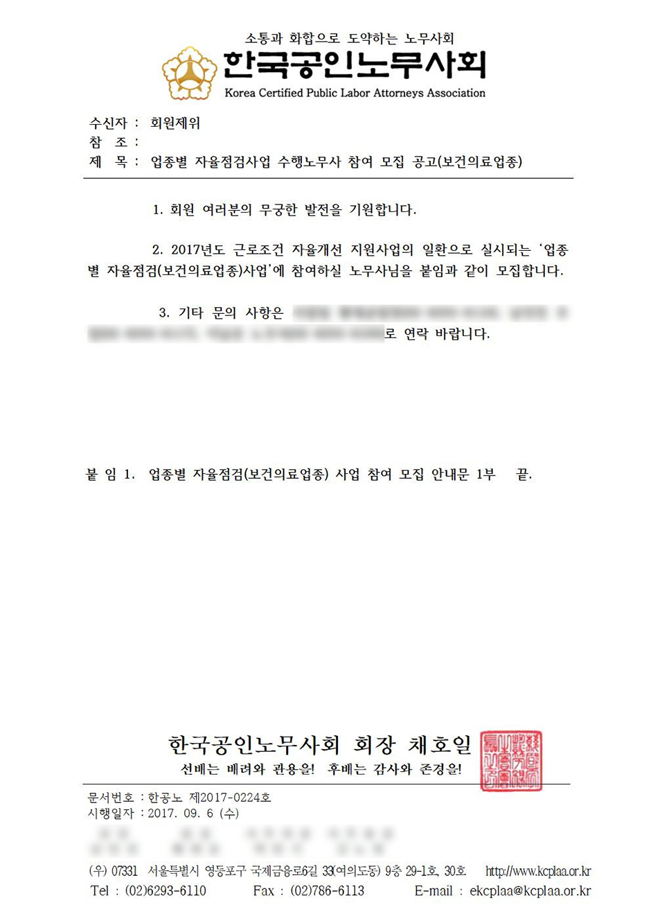 이런 공문들 중에는 매년 공인노무사회로부터 '근로조건 자율개선 지원사업'에 참여 신청을 하라는 내용의 공문도 있다. 작년의 경우에는 5월 초에 공문이 내려왔지만, 올해는 상당히 늦은 8월 말에 자율개선 사업 지원 신청이 시작되었다.