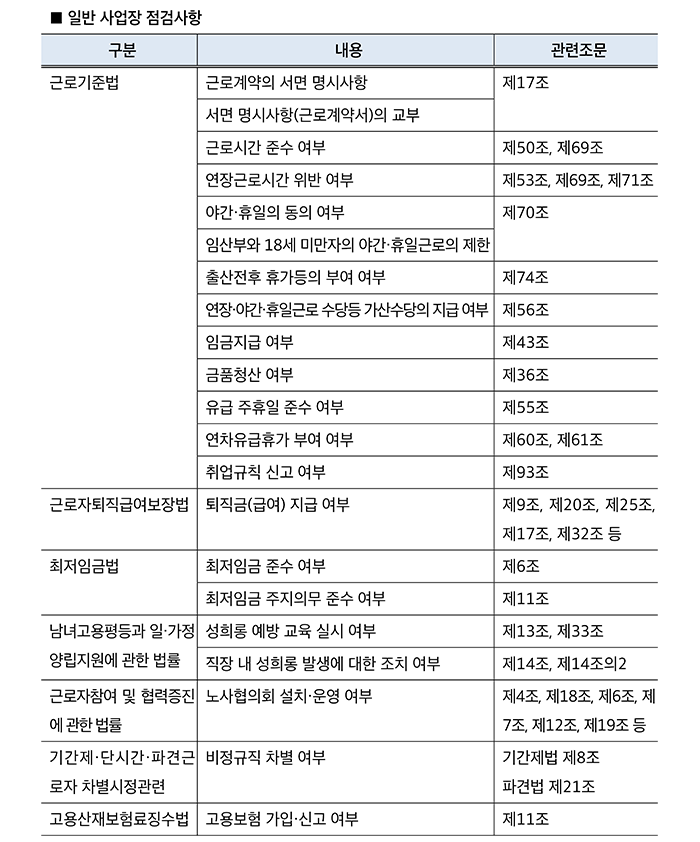 일반사업장의 경우에는 근로기준법부터 최저임금법, 기간제법, 남녀고용평등법 등 전반적인 사항에 대해서 점검이 이루어지게 되며, 근로계약, 임금체불, 성희롱 예방교육의 실시, 최저임금 위반 여부, 취업규칙 작성·변경 관련 신고유무, 노사협회의 설치 등을 점검하게 된다.