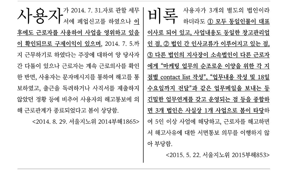 사건을 진행하다 보면 뜻하지 않게 통제불가능한 변수를 만나는 경우가 종종있다. 이번 사건이 그러했는데, 근로자가 근무 할때 사업장의 근로자는 10명이 넘었지만, 실제 옆에서 일하던 동료는 (서류상)다른 사업자 소속의 근로자였던 것이다. 애초부터 다른 사업·사업장이라는 구분이 명확히 되어 있었다면 모를까 동일한 장소에서 동일한 업무를 하는 상황에서는 서로가 다른 사업자 소속의 근로자라고는 알기 어려운 일이다.