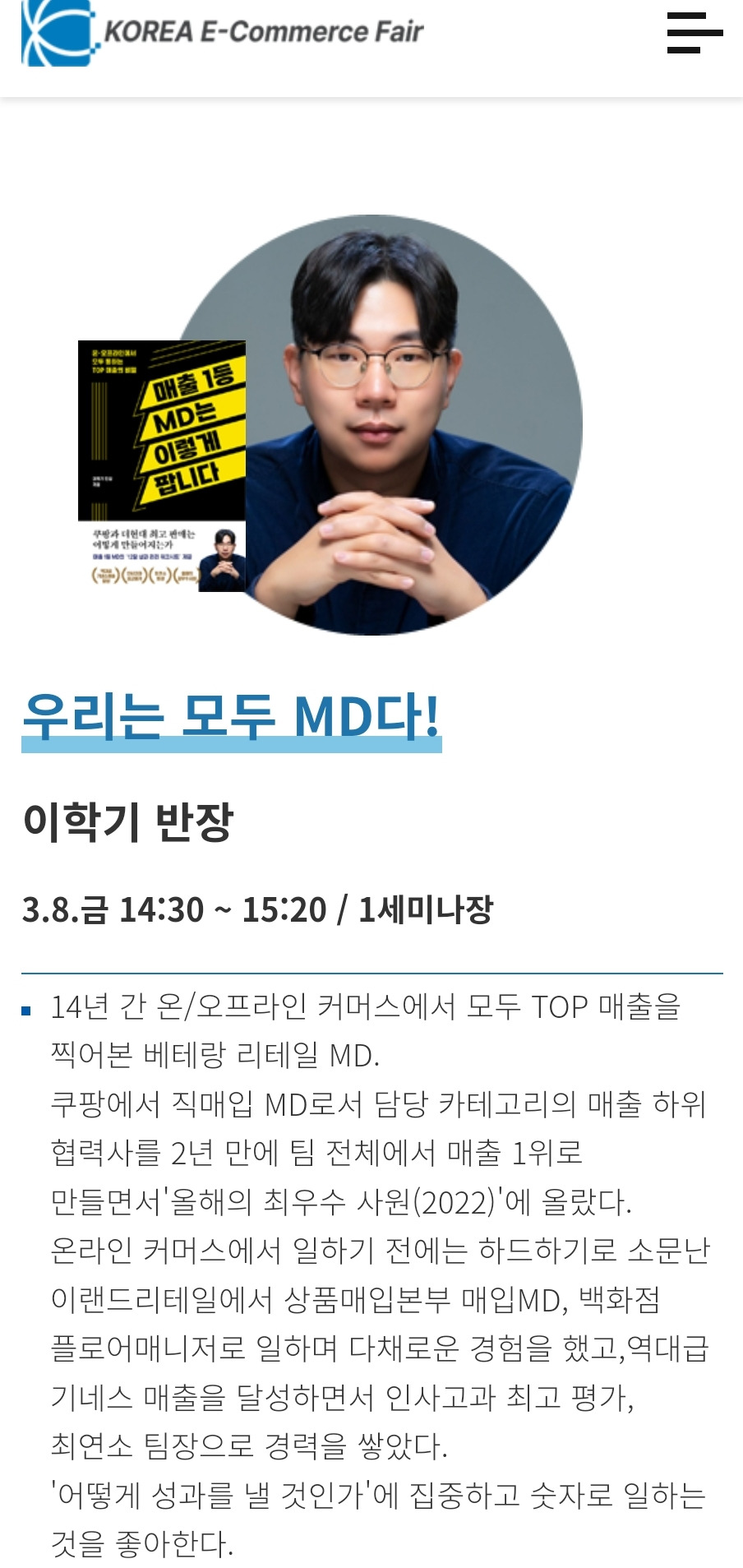 <2024 코리아 이커머스 페어>에 연사로 초대받았어요. 내일(금) 학여울역 SETEC 1세미나장에서 14:30부터 특강을 진행합니다 :)
