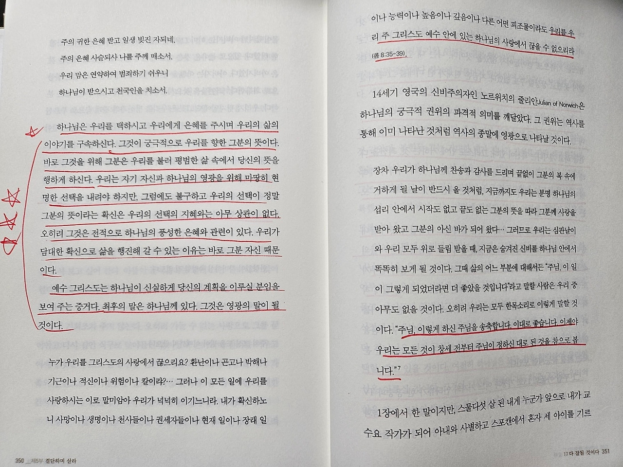 회사 동료가 제주 올레길을 다녀와서 해준 말이 있다. 올레길은 안내 표시를 잘 찾아서 따라가지 않으면 방향을 잃기 쉬워서 마치 인생길 같았다고 한다. 미지의 길을 알고 가는 것이 아니라 믿고 가야 했기 때문이란다. 우리는 미래를 살 수 없기에 저자는 미래를 이렇게 정의한다. "그러나 미래는 아직 일어나지 않았다. 그것은 사실이 아니라 가능성이다."(259쪽) 또한 그는 미래의 소망을 이렇게 표현한다. "예수 그리스도는 하나님이 신실하게 당신의 계획을 이루실 분임을 보여 주는 증거다. 최후의 말은 하나님께 있다. 그것은 영광의 말이 될 것이다."(350쪽) 인생 전체가 신실한 하나님의 손에 있기에, 현재를 거룩하고 충실하게 살아가고자 하는 이에게 하나님은 분명 영광스러운 상급을 줄 것이다. 마음속에 '주 은혜임을'이라는 찬양이 울려 퍼진다. '세상 소망 다 사라져 가도 주의 사랑은 끝이 없으니 살아가는 이 모든 순간이 주 은혜임을 나는 믿네.'