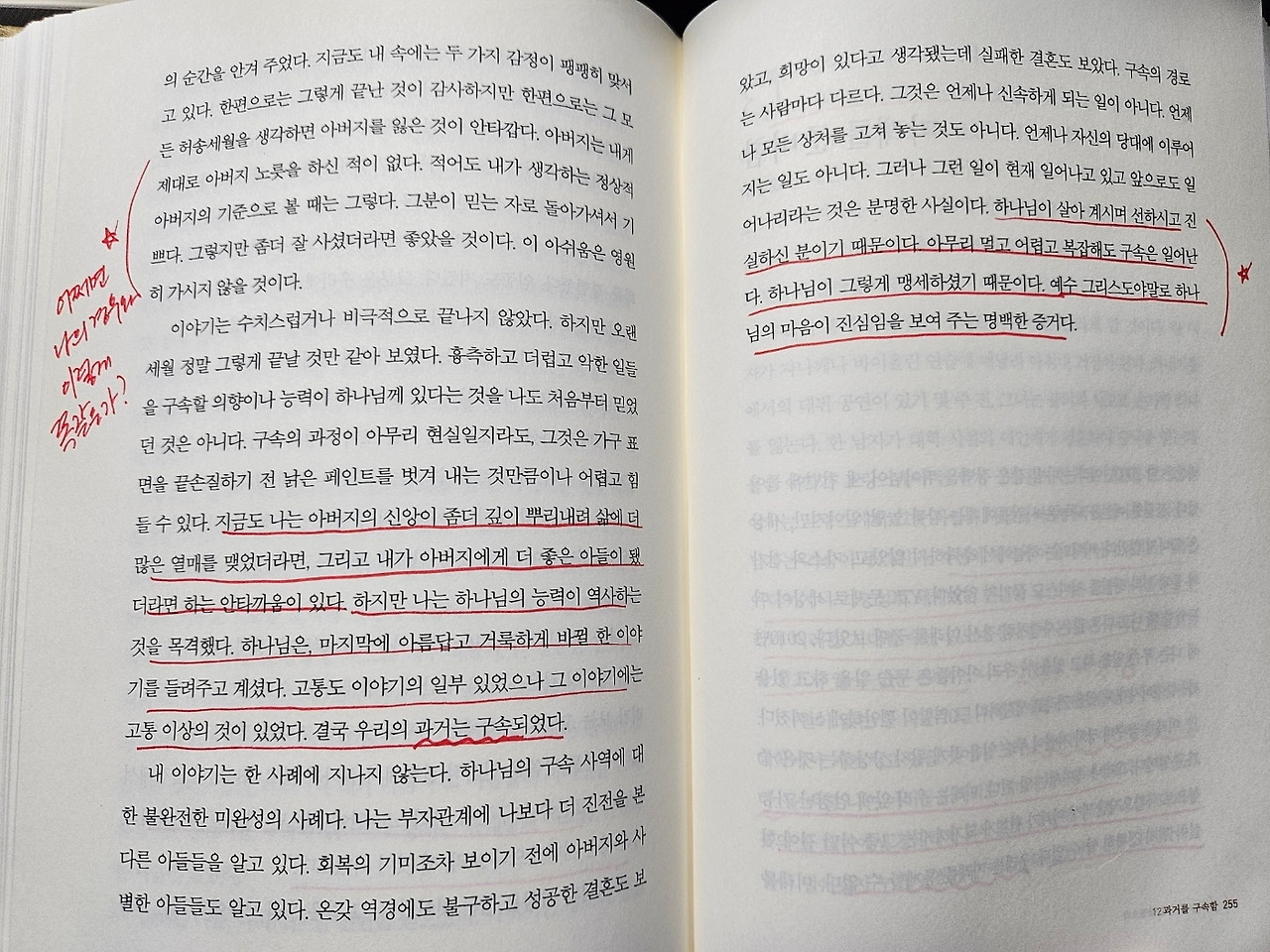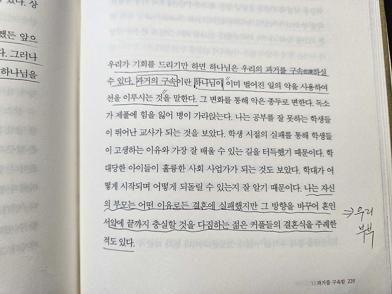 엄마를 잃었을 때, 나는 하나님의 숨은 뜻을 찾고 있었다는 것을 깨닫게 되었다. 마치 시계를 볼 때 명확하게 침이 가리키는 현재의 시각이 아닌, 수많은 부속품이 정교하게 작동하는 보이지 않는 메커니즘을 보려고 했던 꼴이었다. 시계는 하루 24시간 속에서 현재의 시각을 알려 준다. 시계공이 아닌 이상 복잡한 시계의 메커니즘에 대해서는 고작 건전지 교체 법과 시각을 맞추는 다이얼 사용법 정도만 알아도 된다. 그래도 시계는 이상 없이 작동한다. 저자는 고백한다. "그래서 나는 모호한 것을 알아내려 하지 않고 명확한 것을 행하는데 초점을 맞추었다. (중략) 숨은 뜻은 하나님이 알아서 하시리라고 믿으면서 이미 알고 있는 하나님의 계시된 뜻을 부둥켜안았다."(184쪽) 그는 고통의 상황 속에서도 여전히 하나님은 신실하신 분임을 믿기로 선택하고 현재 계시된 하나님의 뜻을 따른다.