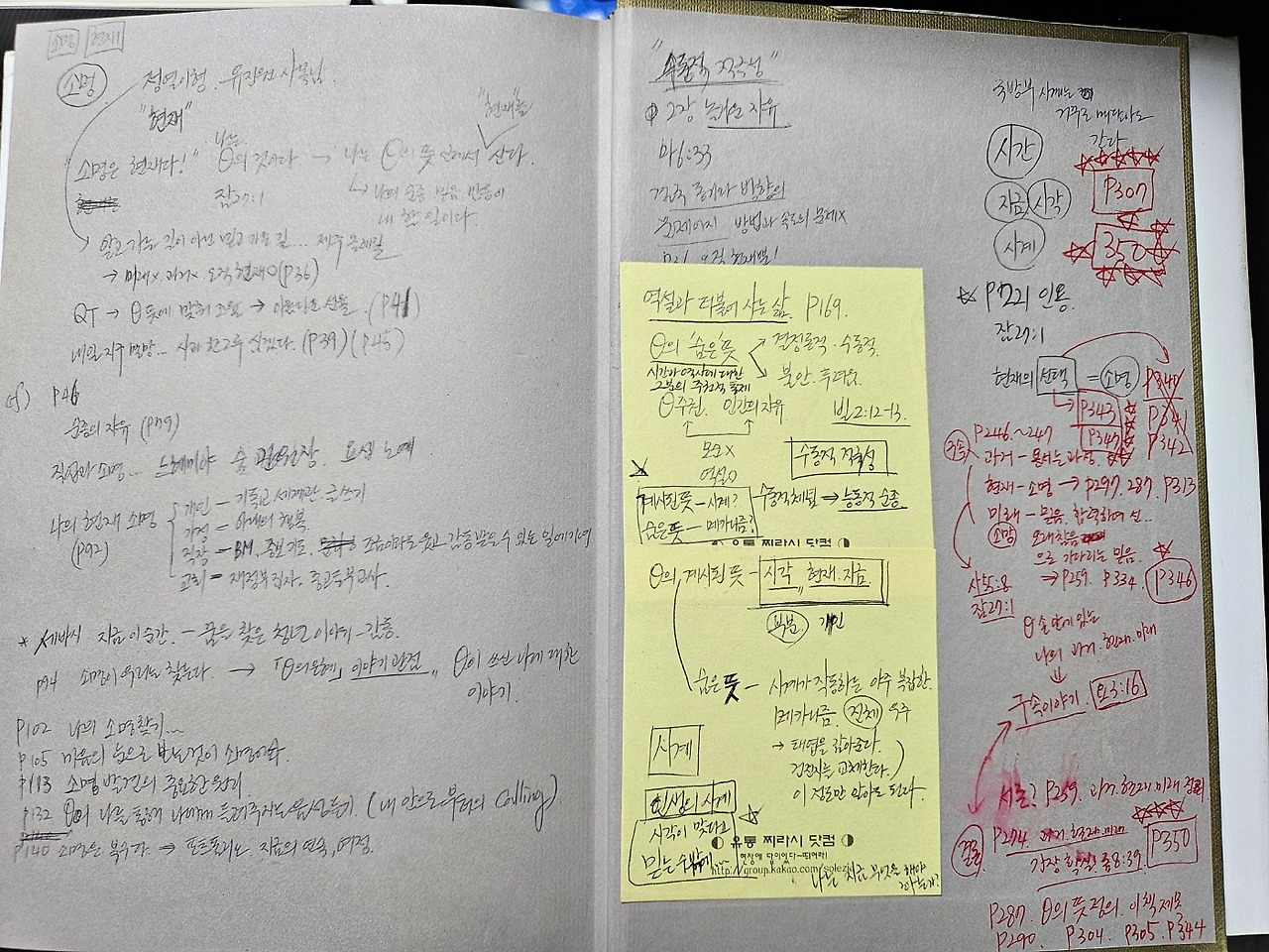 인생의 시계가 가리키는 현재에 하나님의 뜻을 위해 무엇을 해야 하는가? 나의 소명이 무엇인지 찾기 시작했다. 소명 지도사인 지인의 도움을 받아 공동체 안에서 나를 잘 알 수 있는 지인 30명에게 나의 달란트가 무엇인지 물어보았다. 피드백을 통해 중복되는 키워드들을 카테고리화하니 내가 어떤 사람인지, 나의 소명이 무엇과 관련 있는지 정리할 수 있었다. 그런데 놀라운 점은 무의식 중에 내가 이미 직장에서 소명 의식으로 일하고 있었다는 사실이었다. 처음에 소명은 완전히 새롭고 특별하며 위대한 것이라고 생각했었다. 그러나 소명은 현재 작은 일상 속에 있었다. "오히려 그것은 지금 하는 일에 대한 우리의 태도를 바꾸는 데 달려있다. 우리의 성화는 일을 바꾸는데 달린 문제가 아니라 평상시 자기 자신을 위해 하던 일을 하나님을 위해 하는 데 달려 있다."(313쪽)