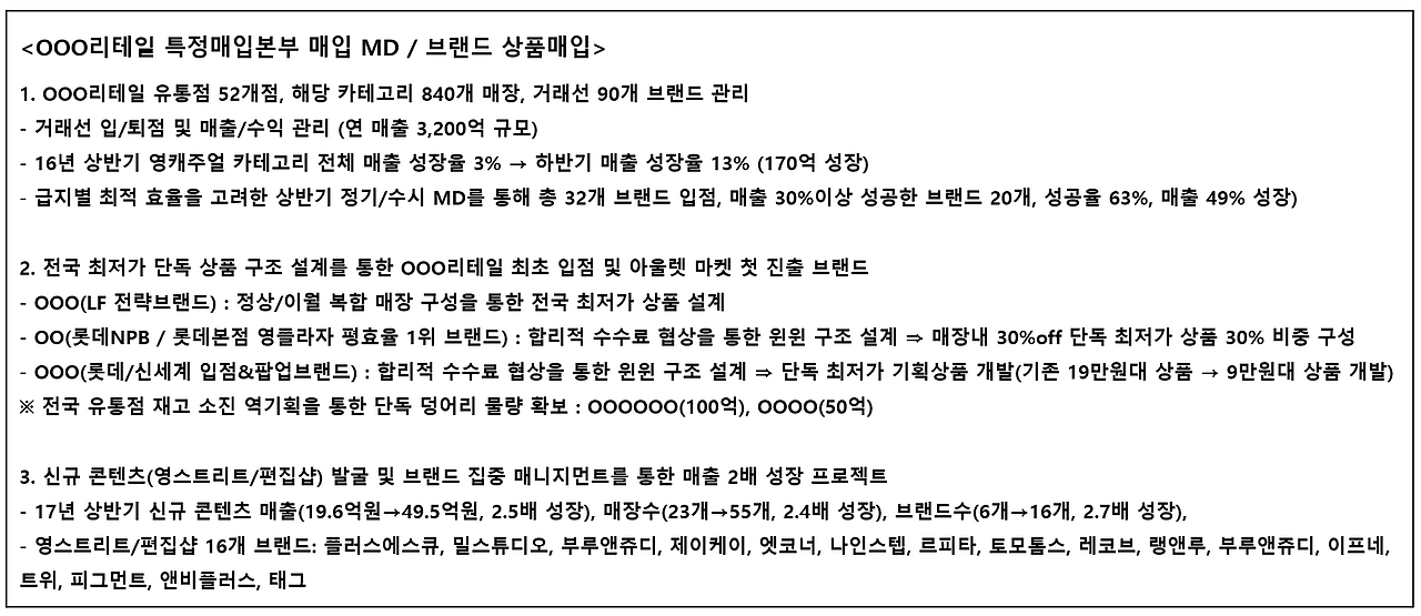 핵심 역량에서 나만의 차별화된 경쟁력이 무엇인지 자신 있게 말할 수 있어야 하는데요. 예를 들어, 내가 다른 MD들 보다 소통을 잘해서 협상력이 좋다든지, 마케팅을 잘해서 상품 판매 적중률이 높다든지, 상품을 보는 눈이 좋아서 킬러 아이템을 여러 개 만들었다든지 등 성과를 중심으로 나는 어떤 노하우를 갖고 있는지 정리해 보세요.