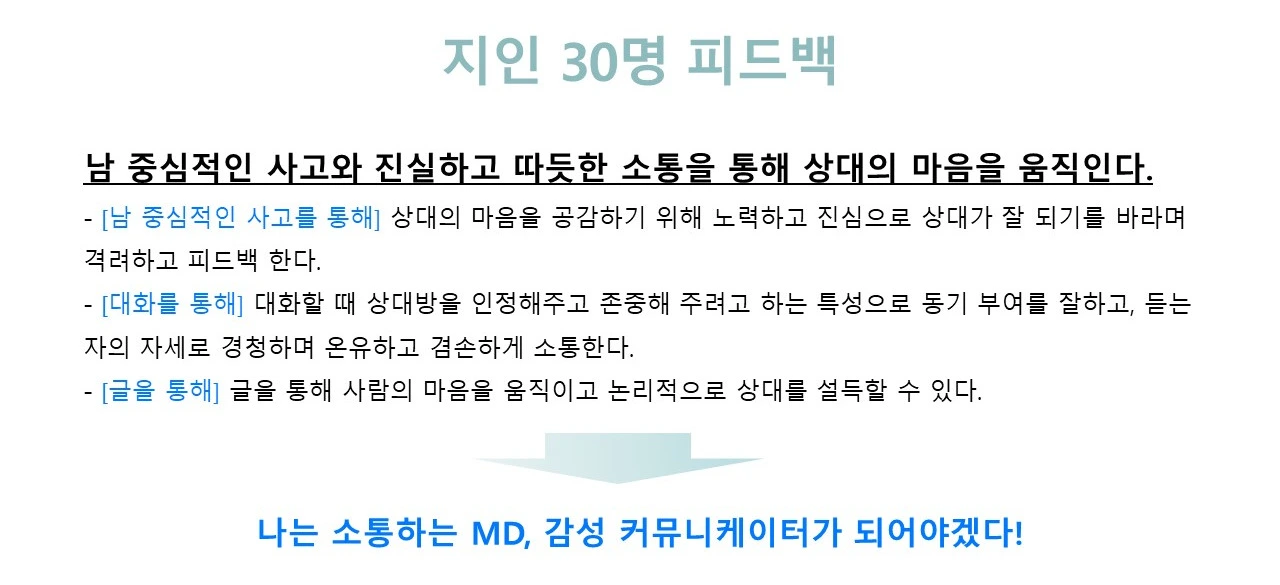 [그림 5]는 면접 시 당황할 수 있는 질문에 답을 달아놓은 내용이에요. 지혜롭게 잘 활용하여 좋은 결과를 얻길 바랍니다. 마지막으로 [그림 6]은 자기 강점을 발견하기 위한 꿀팁인데요. 저는 지인 30명에게 저의 강점이 무엇이고, 그 강점이 잘 발휘된 사례에 대해 물어보았습니다. 30명의 피드백을 종합해 보니 저의 강점이 무엇인지 정리가 되더라고요. 그래서 저는 수많은 MD 중에 'one of them'이 아닌, 저만의 강점을 극대화한 유일한 MD로서 'only one'이 되기 위해 노력했어요. 여러분도 자신의 강점이 궁금하다면 지인들에게 물어보세요. 내가 몰랐던 나 자신을 발견하게 될 수도 있습니다.