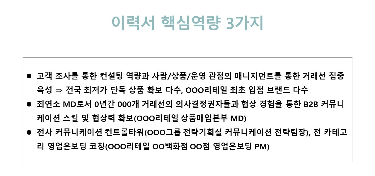 [그림 1]은 실제로 제가 첫 이직 때 합격했던 이력서 내용입니다. 물론 정답이라고 할 수는 없지만, 감을 잡기 위한 예시라고 생각하고 참고해 주세요. 어떤가요? 조금 감이 오나요? '아' 다르고 '어' 달라서 똑같은 일을 했고, 똑같은 성과를 냈어도 어떻게 표현하느냐에 따라 나의 가치가 달라질 수 있습니다. 나의 젊음과 열정을 쏟아부어서 했던 일, 나의 땀과 눈물이 만든 성과를 정말 가치 있게 상대에게 전달할 수 있는 사람은 나 자신밖에 없어요. 핵심 역량 3가지를 정리하는 데 많은 고민과 시간이 필요합니다.