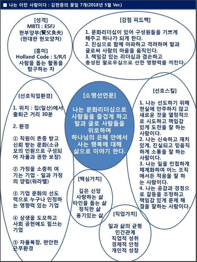 소명지도사 과정을 통해 TNTQ로 직업적 소명 가설을 세웠다면(08화. "오잉? 나의 소명이 OO라고?" 참고 https://brunch.co.kr/@cpotss2023/278) 소명학교를 통해서는 나의 진로와 소명에 관련된 '꽃잎 7개'를 완성했다. 꽃잎 7개란 '성격'과 '강점', '선호직업환경'과 '선호스킬', '핵심가치'와 '직업가치', 그리고 '소명선언문' 7가지 내용을 마치 꽃송이처럼 한 페이지에 정리한 것을 뜻한다. 당시 정리했던 나의 꽃잎 7개를 공개한다.