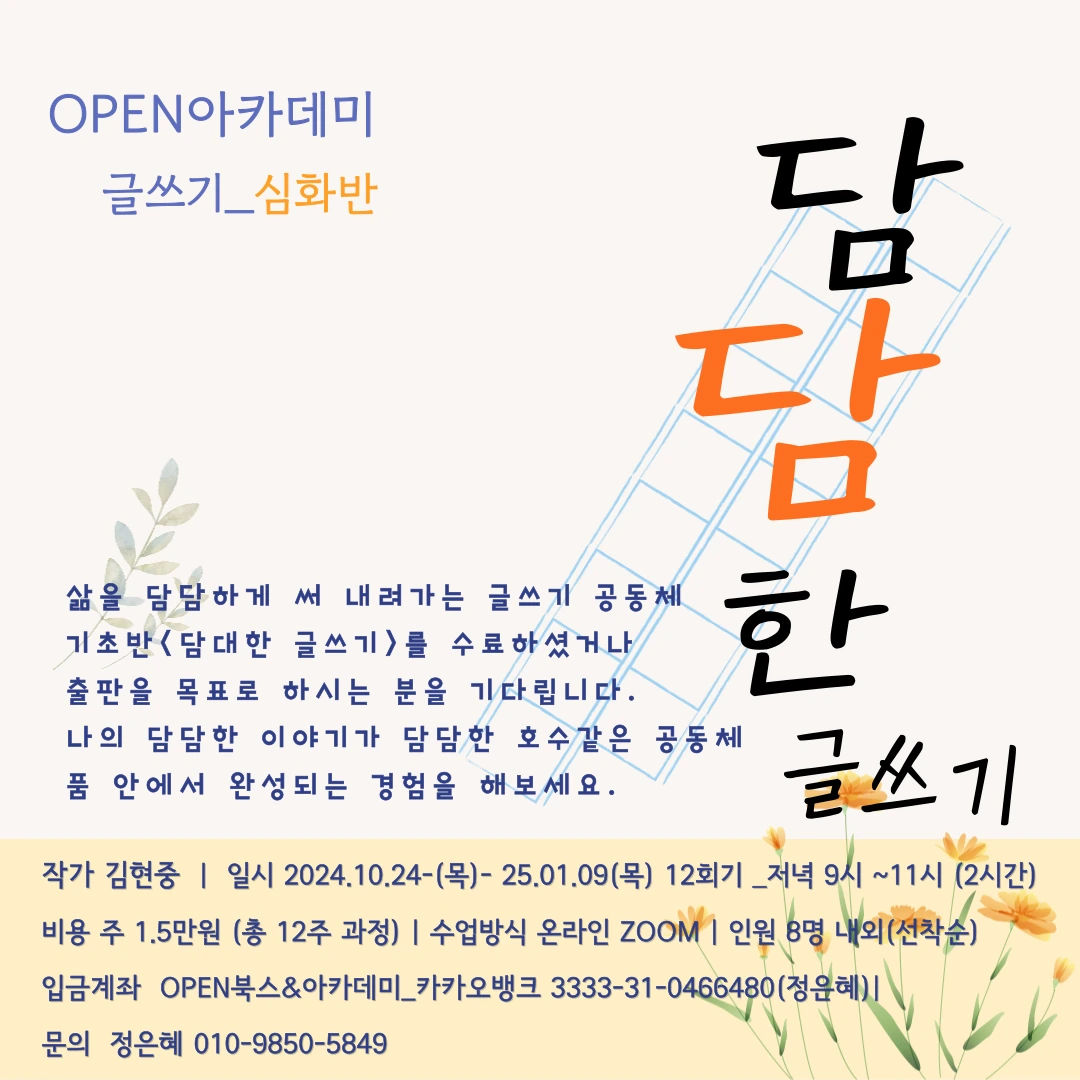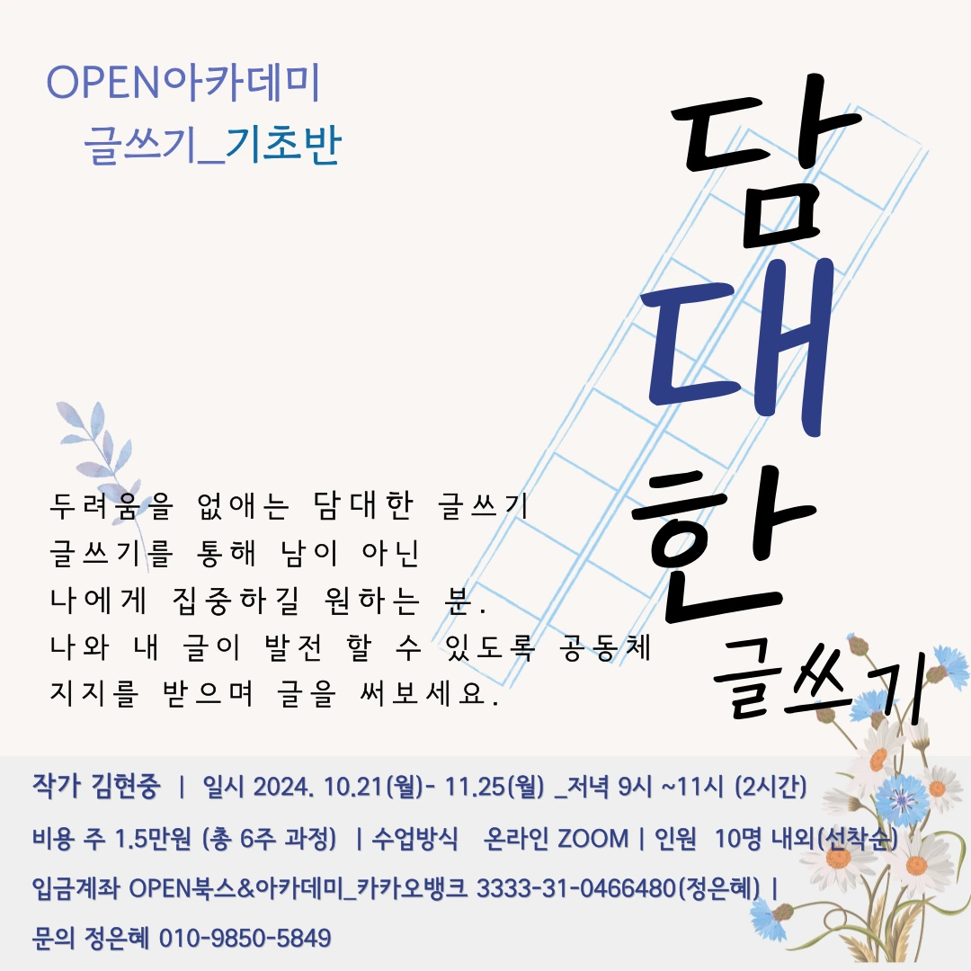 <담대한 글쓰기> _ 2기 지원신청서 글쓰기를 통해 남이 아닌 나에게 집중하길 원하는 분들을 위한 글쓰기 공동체 <담대한 글쓰기> 입니다. 6주간 함께 쓰고, 읽고, 나누며, 지지받는 여정에 함께 할 여러분을 기다립니다. * 일시: 202