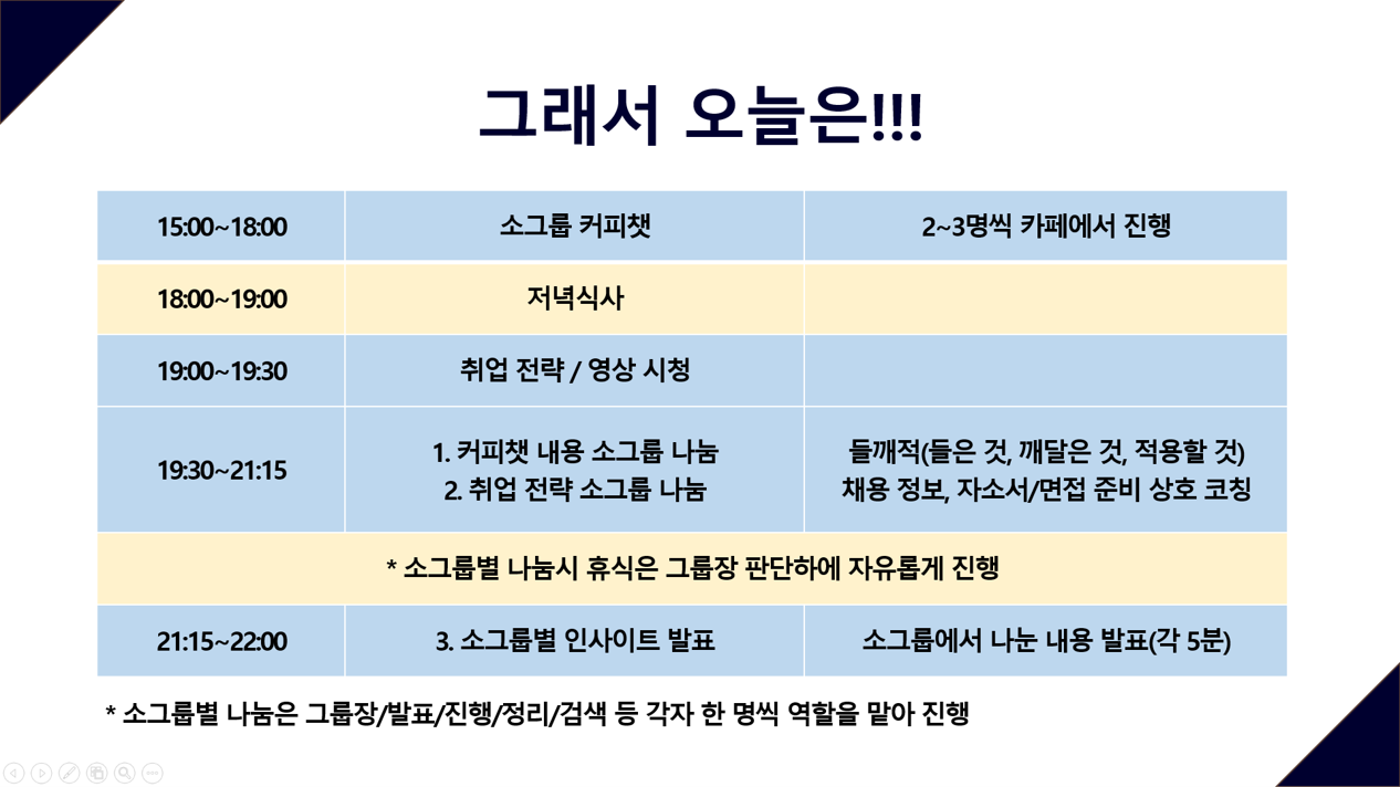 지인의 몇 마디가 나의 관점을 180도 바꿔주었다. 역시 전문가는 다르구나 싶었다. 지인의 말을 곱씹으며 다음날 진행할 커리큘럼과 강의 자료를 수정했다. 그리고 매니저에게 전화해서 자초지종을 설명하고 좀 더 실질적으로 도움이 될 수 있는 진행 방식에 대해 의견을 나눴다. 매니저는 원래 강의를 다 마친 후에 진행하려고 했던 커피챗 시간을 다음날 강의 전에 3시간 정도 소그룹으로 진행해 보면 어떻겠냐고 제안했고 나는 흔쾌히 수락했다. 이로써 총 24시간짜리 강의가 되었다.