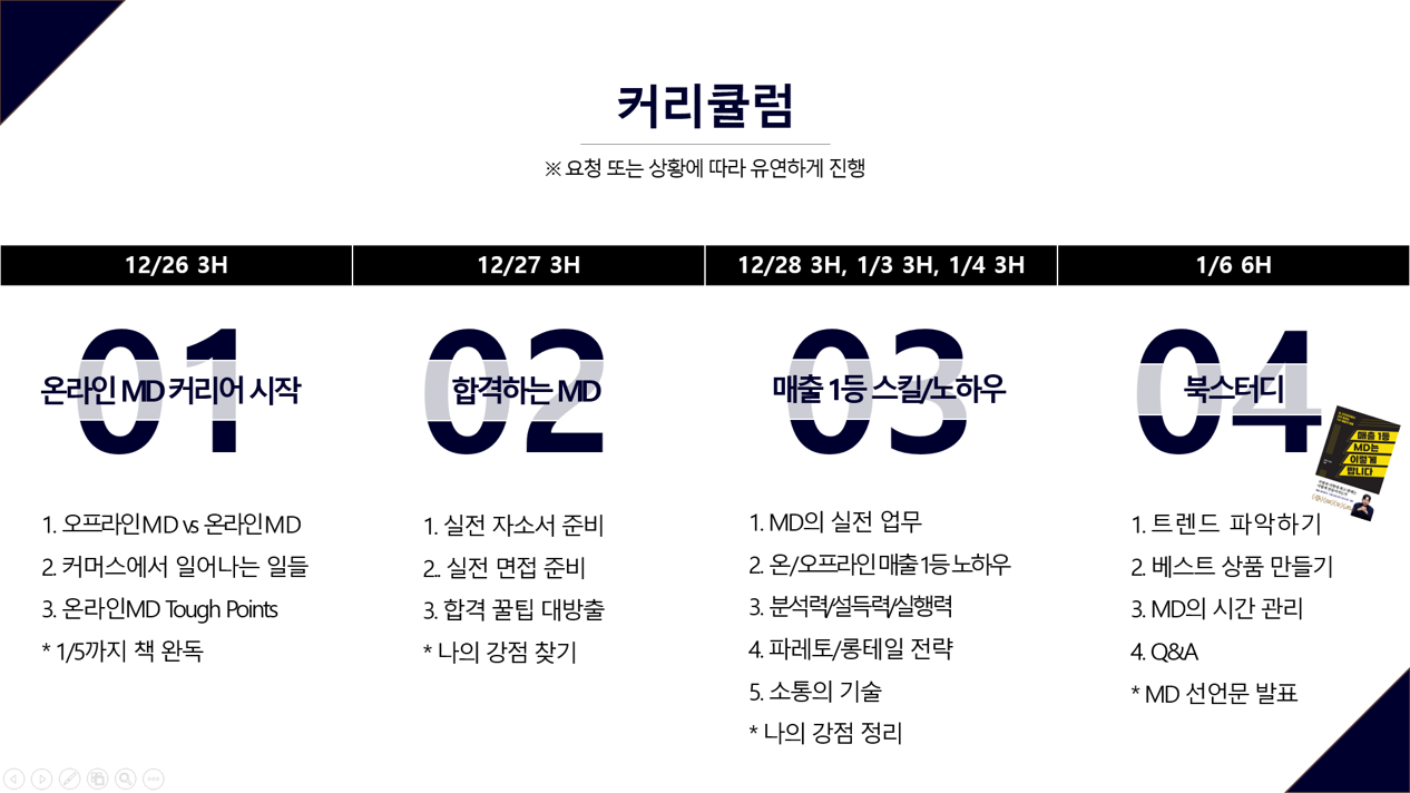 B2B, B2C, B2G 교육 등 여러 이야기가 오고 갔지만, 시기적으로 정부지원사업인 B2G부터 한번 협업해 보면 어떻겠냐는 제안을 받았다. 퇴사와 동시에 강의라니, 일이 술술 풀리는 것 같았다. 첫 직무 강의 때는 주 1회 3시간씩 총 4주간 12시간을 진행했는데 이번에는 2주간 6일에 걸쳐 총 21시간짜리였다. <매출 1등 MD는 이렇게 팝니다>도 출간됐겠다, 기존 강의 자료도 있겠다, 해볼 만하겠다고 느껴 수락했다. 무엇보다 내겐 닥치는 대로 경험을 쌓는 것이 중요했으니까.