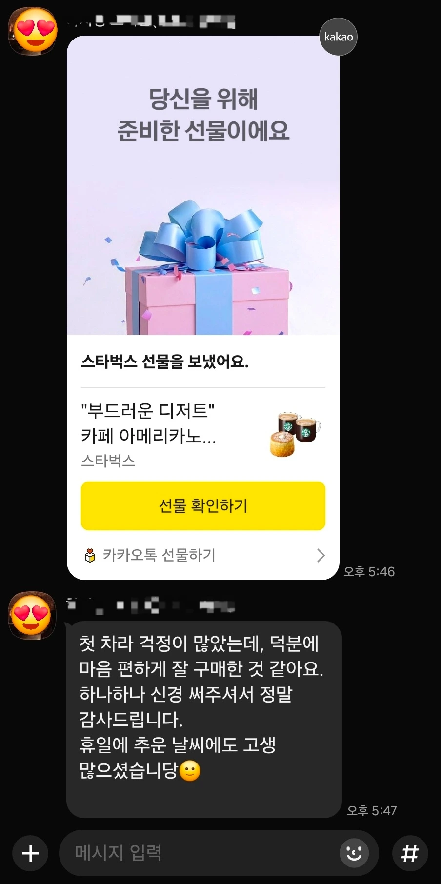 차량 출고 후 동생분이 커피 쿠폰과 함께 감사 메시지를 보내왔다. 동행했던 이랜드 후배이자 로로님의 남편이자 동생분의 형부도 “현중님, 중고차에 대한 불신이 컸는데, 오늘 직접 겪어보니 생각이 완전히 달라졌어요.”라며 엄지손가락을 치켜세웠다. 중고차에 대한 불안한 의심을 안전한 확신으로 바꾸는 것이 ‘책 쓰는 중고차 딜러’로서 나의 소명이라 생각했는데, 마음 한가득 뿌듯함이 차올랐다.