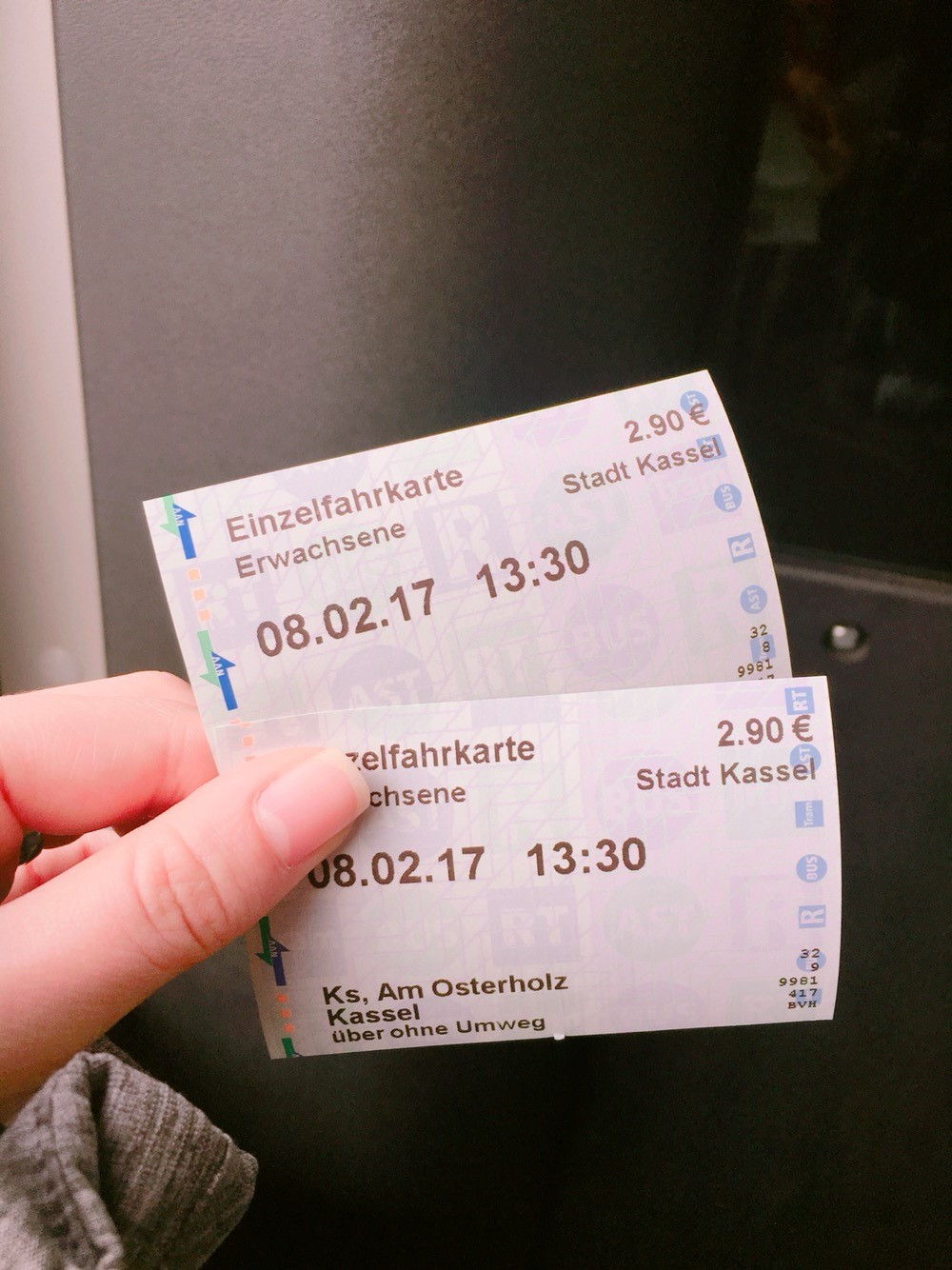 카셀 시내로 가는 32번 버스 노선도(왼쪽) / 인당 2.90유로 버스표(가운데) / 카셀 시내에서 기념샷(오른쪽)