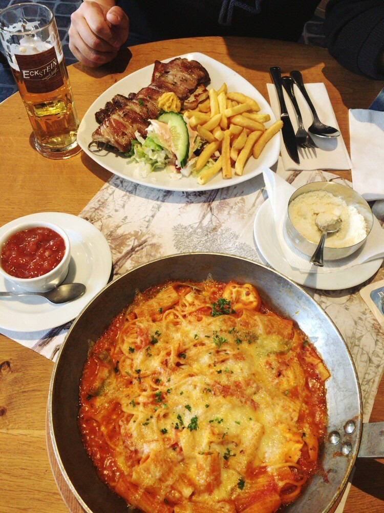 맥주가 먼저 나왔다. 아내의 얼굴에 미소가 번졌다. 맥주를 마시며 여유롭게 기다리니 주문한 음식이 나왔다. 오래 기다리다 허기져서 맛있는 건지, 진짜 음식 자체가 맛있는 건지 헷갈리게 만드는 맛집의 마법에 빠진 것일까? 치킨 요리도 맛있었지만, 진짜 대박은 모듬 파스타였다. 모듬 파스타는 다양한 파스타 면들의 종합 선물 세트였는데 익숙한 스파게티 면, 리본과 튜브 모양의 면, 꼬불꼬불한 나사 모양의 면 등이 한 데 어우러져 있었다. 파스타를 크게 좋아하지 않는 나도 지금 다시 독일에 간다면 가장 먼저 먹고 싶을 정도로 모듬 파스타의 맛은 일품이었다.