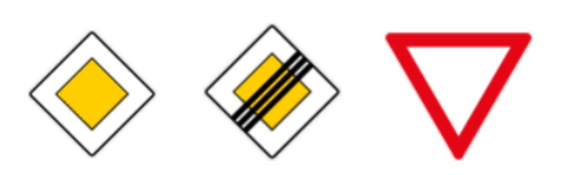 ‘우선통행’ 표지판(왼쪽) / ‘우선통행 종료’ 표지판(가운데) / ‘양보’ 표지판(오른쪽)