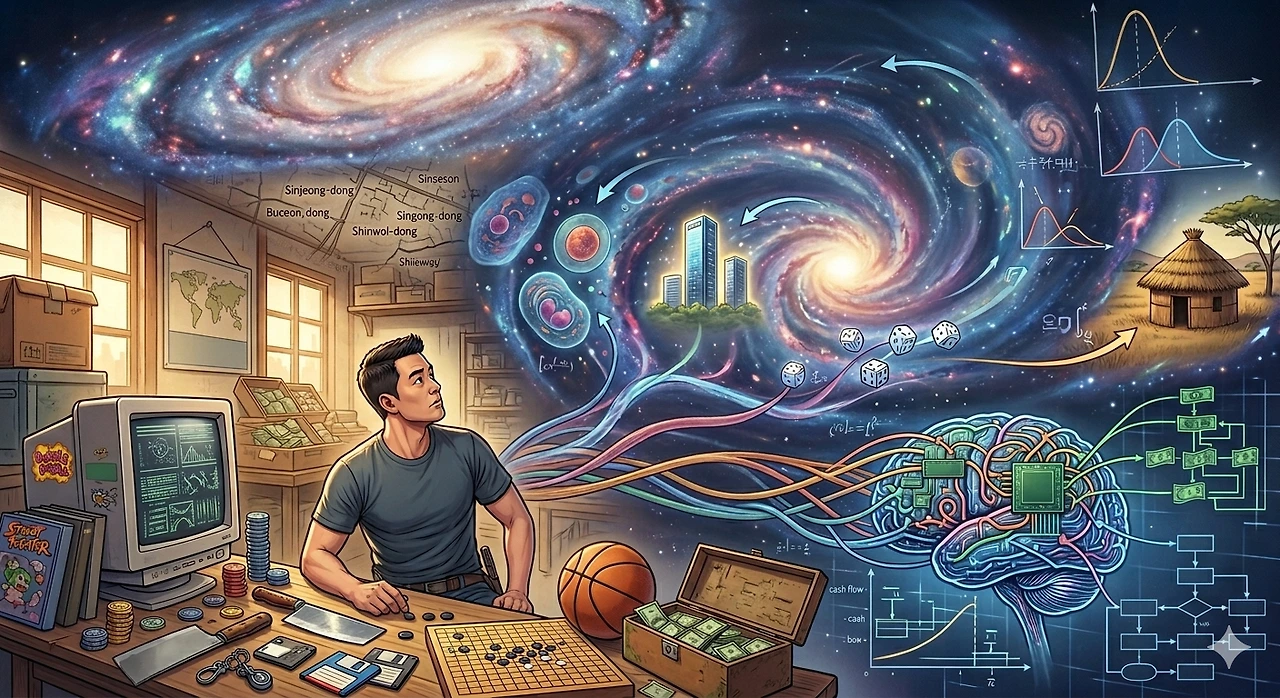 우리는 흔히 스스로의 의지로 삶을 개척한다고 믿지만, 뇌과학과 진화생물학, 그리고 거시세계를 다루는 물리학의 관점에서 보면 인간의 자유의지란 꽤나 머쓱해진다. 물리학의 엔트로피나 유체역학이 증명하듯, 우주의 모든 물질은 무작위적인 확률과 환경적 변수에 의해 그 궤적이 결정된다. 인간이라는 유기체도 예외가 아니다. 유년기부터 소년기까지 우리의 뇌 구조와 성향을 세팅하는 가장 결정적인 요인은, 우리가 결코 선택한 적 없는 '초기 환경(운)'이다. 내 삶을 이루는 95%의 기본값이 철저히 우주적 확률에 의한 '운'으로 세팅된 것이다.