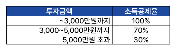 주금으로 납입한 금액(투자금액)에 대해서 다음과 같은 기준으로 소득공제를 받을 수 있습니다. 다만, 소득공제를 받을 수 있는 한도는 해당 과세연도의 종합소득금액의 50%입니다.