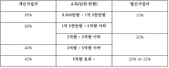 하지만 법인사업자의 경우 같은 구간에서 10% 또는 20% 라는 상대적으로 낮은 세율을 적용받습니다.