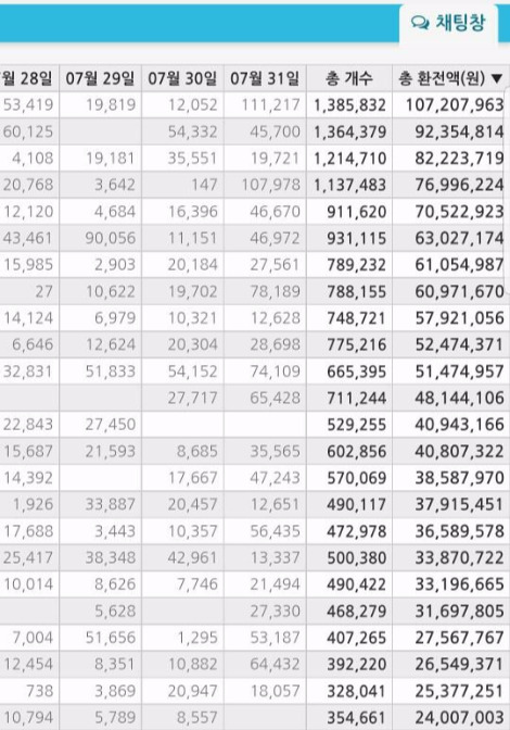 월 단위로 BJ들의 별풍선 수령액 합계를 집계하는데, 맨 오른쪽에 있는 총 환전액이 별풍선 소득이라고 보면 된다.