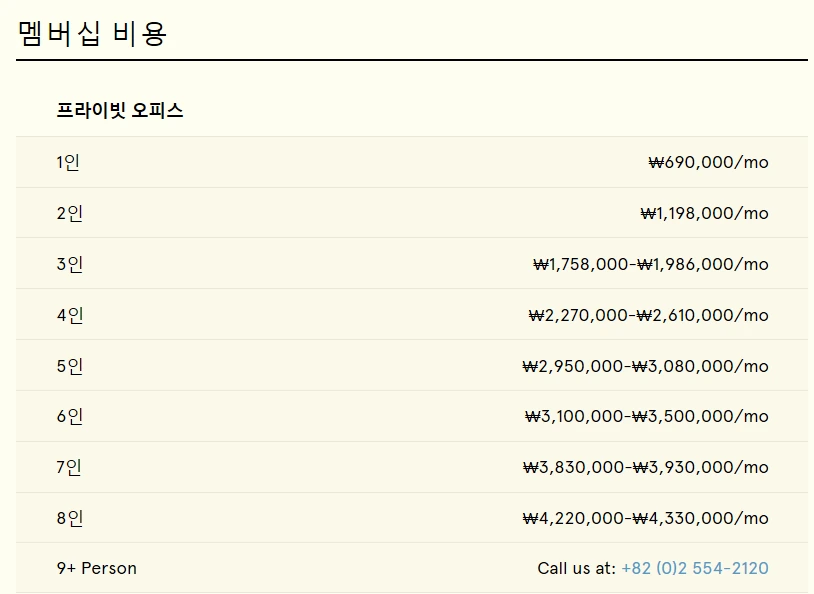위 표는 WeWork 공식 홈페이지에 게시된 멤버십 비용이다.