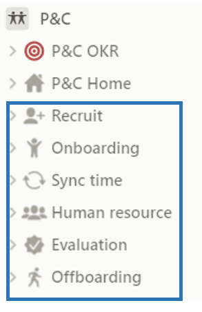 P&C(Peoople&Culture) 팀에서 모든 인사 업무를 담당하고 있는데, 세부 페이지명을 보면 알 수 있다시피 한 사람을 채용하고 퇴사하기까지의 여정대로 배치하였다.