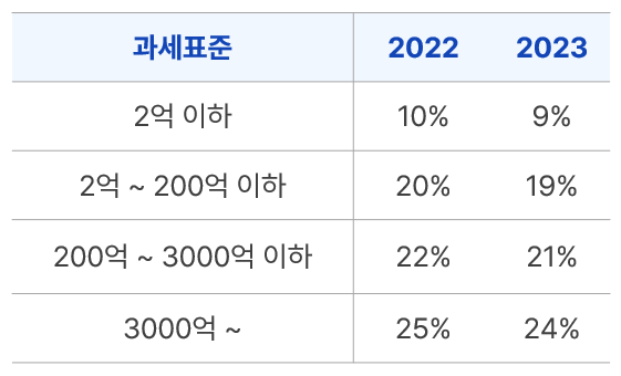 법인 사업자의 세율도 개인사업자와 같이 누진세율 구조이며, 4단계로 구분된다.