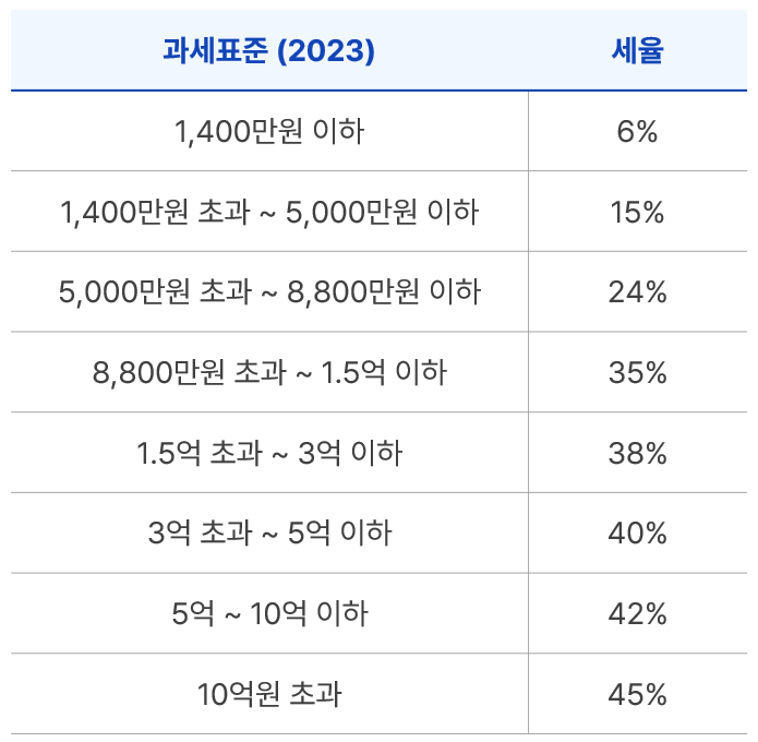 매출에서 비용을 제외하고 나면 세금을 부과하는 기준 금액이 되는 “과세표준”이 나오며, 이 과세표준에 아래의 종합소득 세율을 곱하면 대략 부담해야 하는 세액을 알 수 있다.
