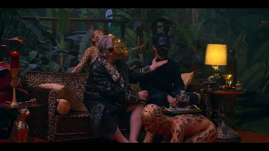 나체를 드러낸 것도 아니고, 개돼지처럼 묶여 있는 것도 아닌, 정체불명의 표범무늬 여인들을 애매하게 전시해놓고, 술을 마시기엔 불편하기 짝이 없어 보이는 반짝거리는 동물가면(이것의 상징성도 너무 올드하다.)을 씌운 것으로 충분하다고 여기지 말고, 미치도록 따분해서 정말로 미쳐버린 개객끼들을 정말로 악과 쾌락의 화신으로 조금이라도 더 그럴싸하게 만드는데 시간을 좀 더 썼어야 하는 것 아닌가?