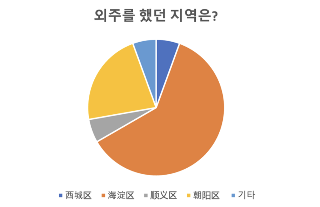 외주 했던 지역을 물어본 설문에서는 대학교가 많이 모여 있는 하이디엔 구가 11명으로 1위를 차지했고, 학생들이 인턴 하는 회사가 많고 생활권이 편리한 차오양구가 2위를 차지했다.