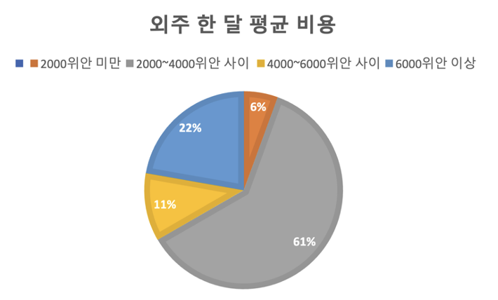 생활비 및 관리비를 제외한 외주 한 달 평균 비용은 2,000위안~4,000위안 사이가 61%로 1위를 차지했다. 6,000위안 이상의 비용이 들었다는 응답자는 총 4명인 22%를 차지했다.