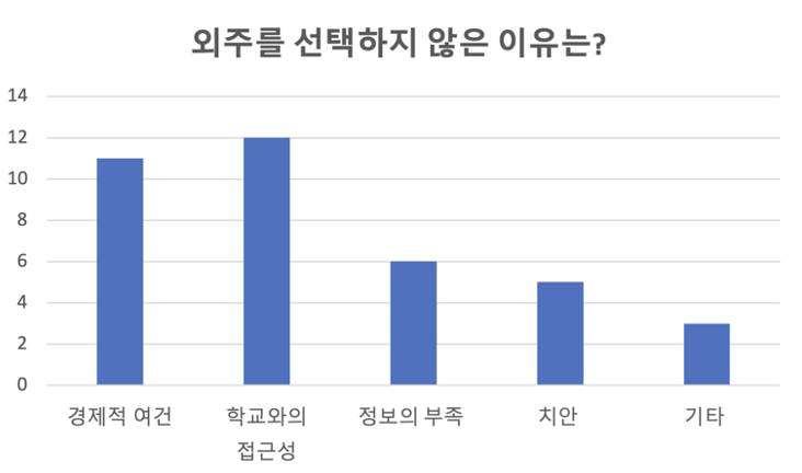 외주를 하지 않는 학생을 대상으로 그 이유를 물어본 설문에서는 학교와의 접근성(12표), 경제적 여건(11표), 정보의 부족 (6표) 등이 주된 사유였다. 기타 의견으로는 장학 프로그램이 기숙사 한정으로만 주거비를 지원해주거나 혹은 중국 생활에 먼저 적응을 한 뒤 외주를 할 계획을 하는 응답자가 있었다