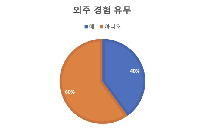 45명의 응답자 중 외주를 하고 있거나 경험이 있는 학생은 약 60%를 차지했다. 상대적으로 학교 기숙사가 아닌 자취를 경험해 본 학생의 비율이 조금 더 높았다.