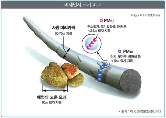PM10이 사람의 머리카락 지름(50~70㎛)의 약 1/5~1/7 정도로 작은 크기라면, PM2.5는 지름이 머리카락의 약 1/20 ~1/30에 불과할 정도로 매우 작다.