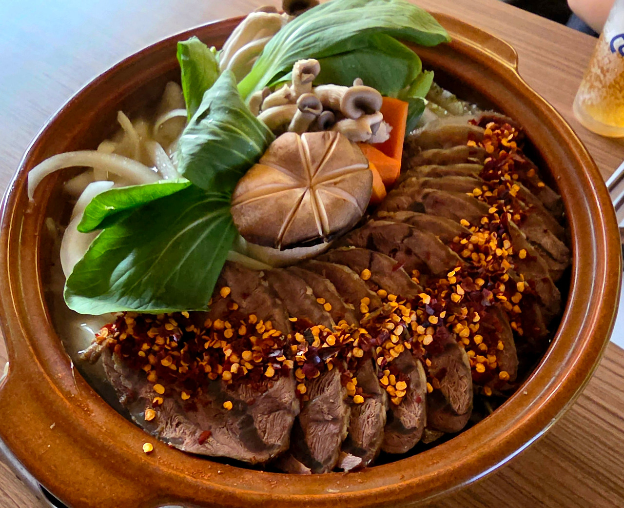 쌀국수 베이스의 뜨끈한 육수 위로 푸짐하게 쌓인 버섯과 푸르른 청경채가 매혹적으로 시선을 붙잡겠으나, 요염하게 일렬로 누워 유혹하는 아롱 수육만큼 아찔할 수는 없다. 부드럽게 익은 그 살결 위로 고소한 기름막이 찰랑이며 물결치듯 번지고, 그 은빛의 윤기가 결마다 스며드는 순간.