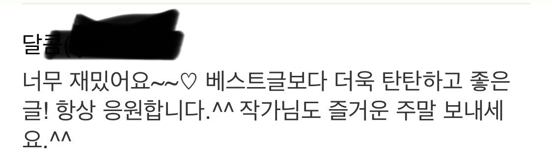 그런데도 불구하고 글을 읽어주는 독자들은 하트를 눌러 나를 응원해 주었다. 그러며 “베스트 글보다 더욱 탄탄한 구성! 언제나 응원합니다.!”라는 칭찬의 댓글까지 남겨주었다. 내가 미안한 마음을 가져야 했던 건, 주인공뿐만 아니라 독자들에게도 마찬가지였던 것이다. 썼던 글을 다시 지우고 성심을 다해 쓰기 시작했다. 그랬더니 막혔던 부분도 뻥 뚫리기 시작했다. 다시 글을 진행시킬 수 있게 되었고, 또한 글쓰기가 다시 즐거워졌다. 50화로 정해두었던 완결의 회차를 24회를 늘려 쓸 수 있었던 것도 모두 칭찬의 힘이었다.
