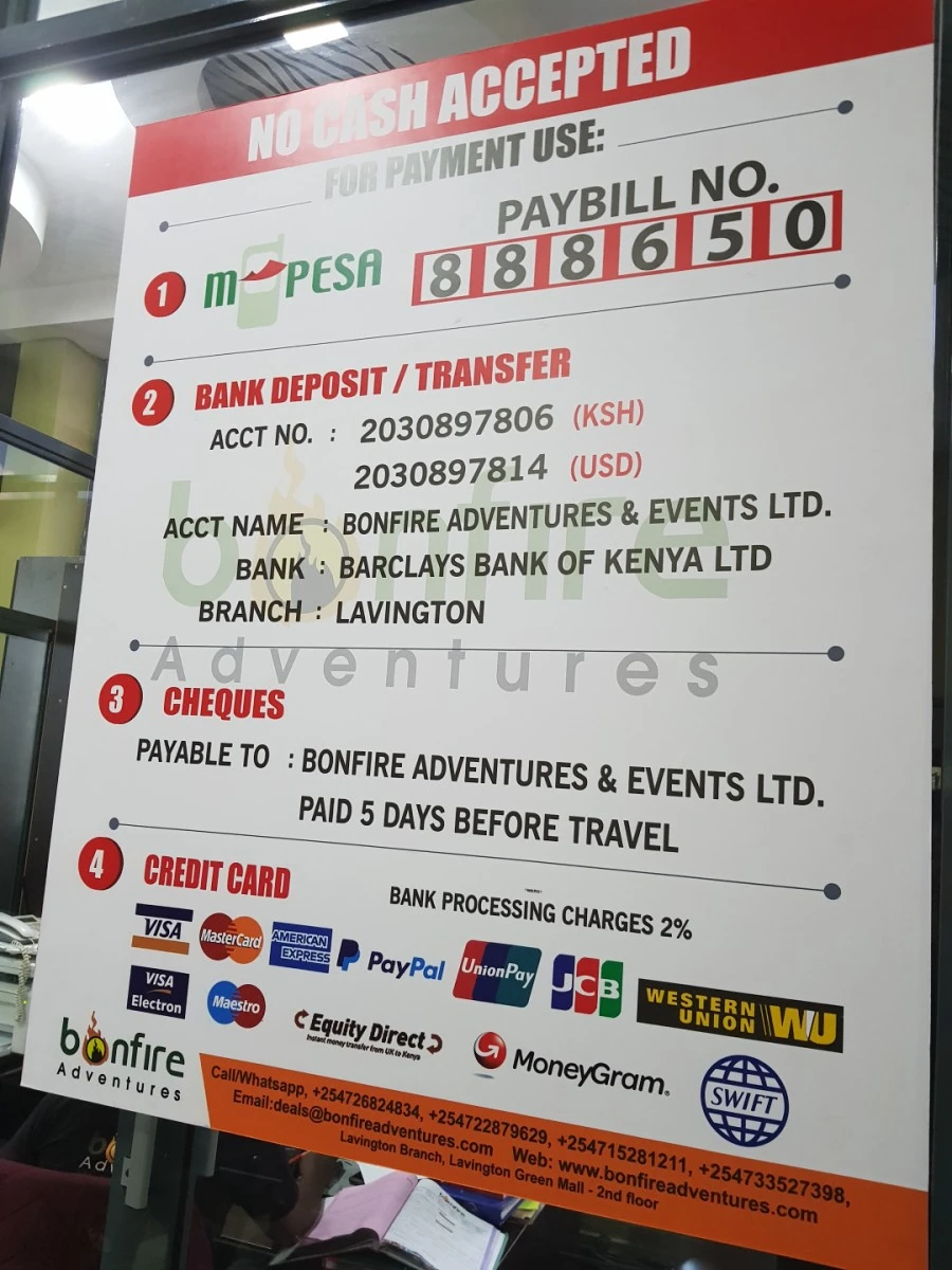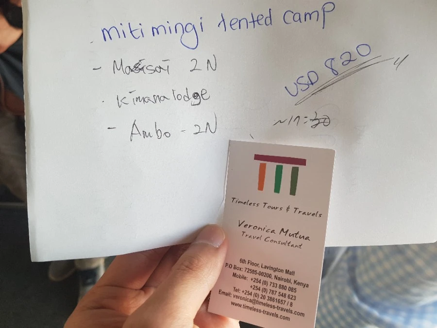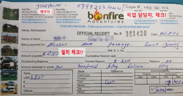 고민하다가, 킬리만자로 산 트레킹은 포기할 수 없어서 마사이마라 2박 3일 투어만 하기로. 예약비 250달러를 현금으로 지급하고 이 여행사의 담당자 및 픽업을 맡는 담당자 번호를 물어서 기록해두었다.